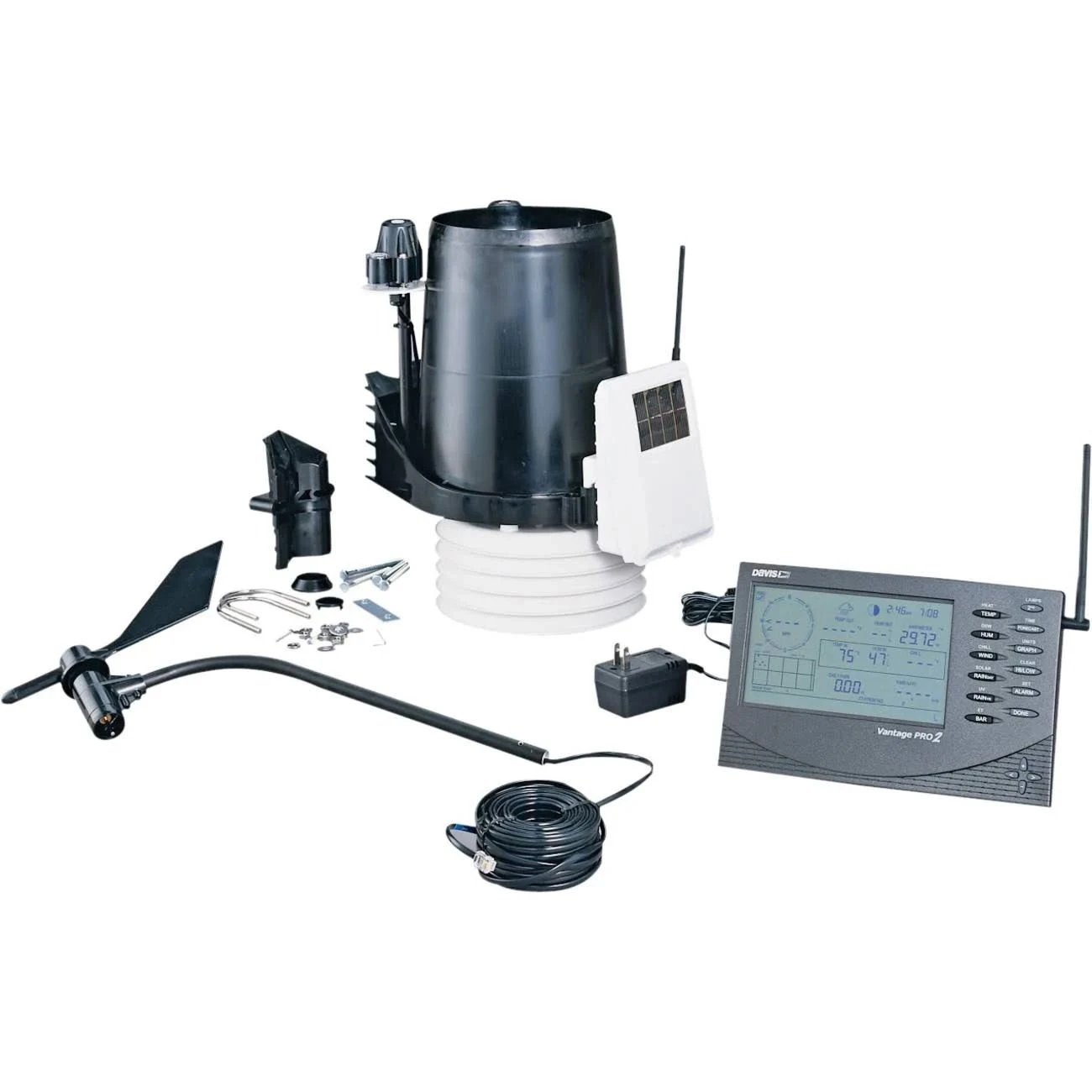 Includes Vantage Pro2â„¢ console/receiver, integrated sensor suite (ISS), and mounting hardware. ISS includes rain collector, temperature and humidity sensors, anemometer, 40′ (12 m) anemometer cable, solar radiation sensor, UV sensor, sensor mounting shelf, and solar panel. Temperature and humidity sensors are enclosed in standard radiation shield.
